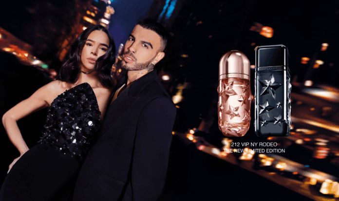 Esta edição limitada reimagina as silhuetas icônicas de 212 VIP Rosé e 212 VIP Black com estrelas em relevo tingidas diretamente no vidro. O design é ousado e inspirado no espírito indomável da cultura do rodeio. A embalagem também se inspira em cowboys, recriando uma textura de jeans em preto e rosa pálido, com o nome de edição limitada, NY Rodeo, escrito em uma fonte que evoca assinaturas bordadas.