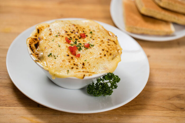 O resultado é um prato suculento e reconfortante, com uma casquinha de queijo gratinado por fora e um recheio intensamente aromático por dentro.