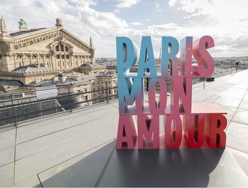 Início Galeries Lafayette inaugura campanha “Paris Mon Amour” Tótem com logo da campanha Paris Mon Amour no telhado da Galeries Lafayette