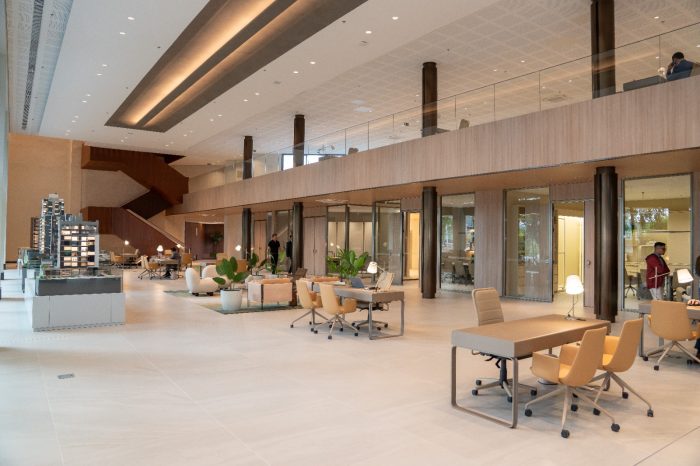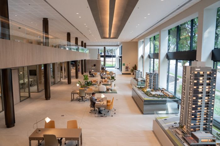No térreo, a central reúne diversas salas de atendimento, entre elas a Sala Personalize — programa desenvolvido em parceria com a Porsche Consulting, consultoria que integra o mesmo grupo da montadora alemã de veículos de luxo. O serviço é exclusivo para clientes que adquirem unidades ainda na fase de obras e permite a personalização de planta, acabamentos e revestimentos, um diferencial que combina praticidade, exclusividade e uma experiência sob medida.