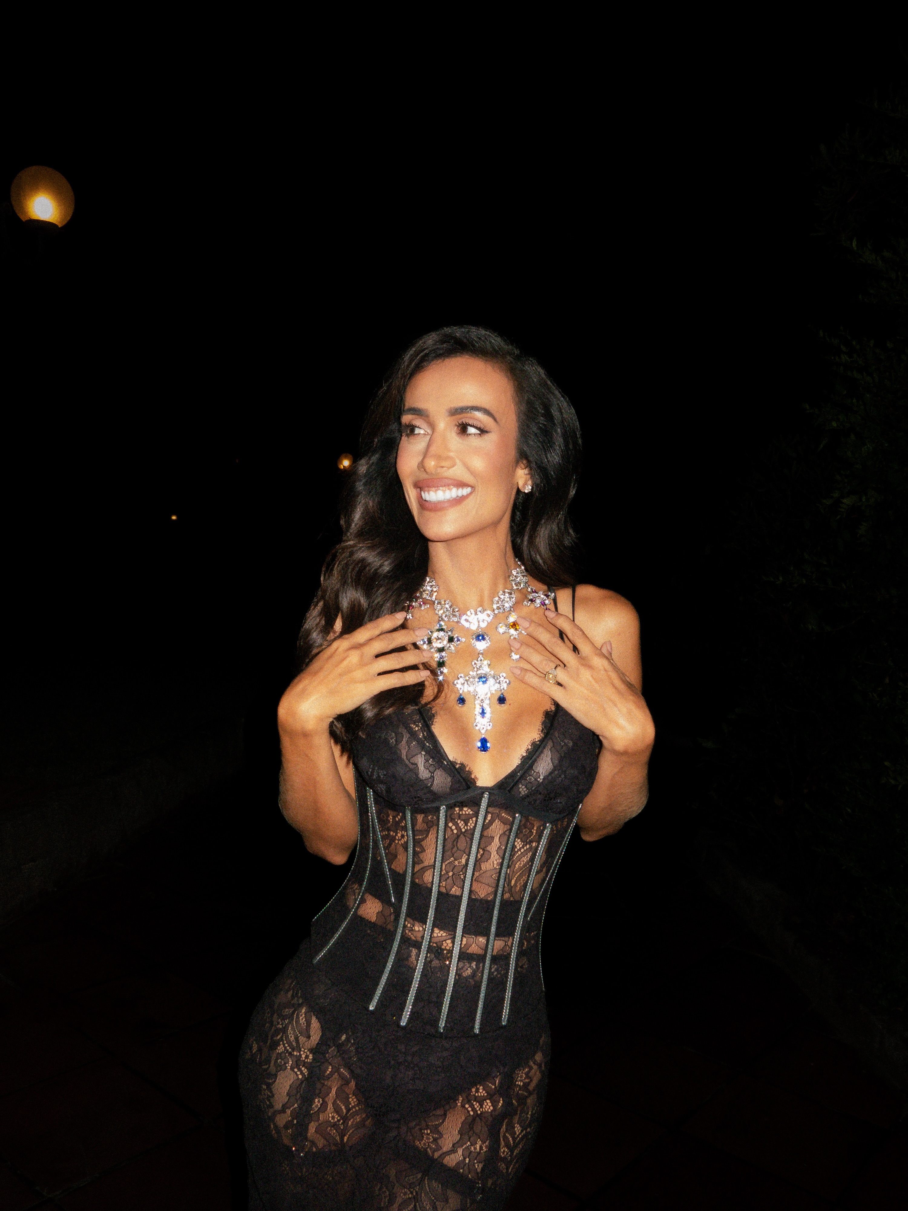 Nesta segunda-feira (1), para a apresentação de Alta Gioielleri, optou por um vestido longo tomara-que-caia colado ao corpo combinado com uma choker de tecido destaque na temporada SS24. A Alta Moda Dolce & Gabbana, que nos anos anteriores passou por locais icônicos como na Capri, Nápoles, Milão, Florença, Veneza, Sicília, Puglia, este ano celebra a beleza e a cultura da Sardenha. Ontem, 2 de julho, o desfile de Alta Moda; Já hoje, dia 3 de julho, o desfile de Alta Sartoria (masculino) e amanhã, 4 de julho, a festa de encerramento.