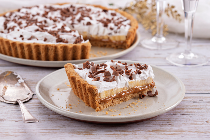 Sua base crocante de biscoito, recheio cremoso de doce de leite e o frescor das bananas se unem ao chantilly leve e às raspas de chocolate para criar uma explosão de sabores.